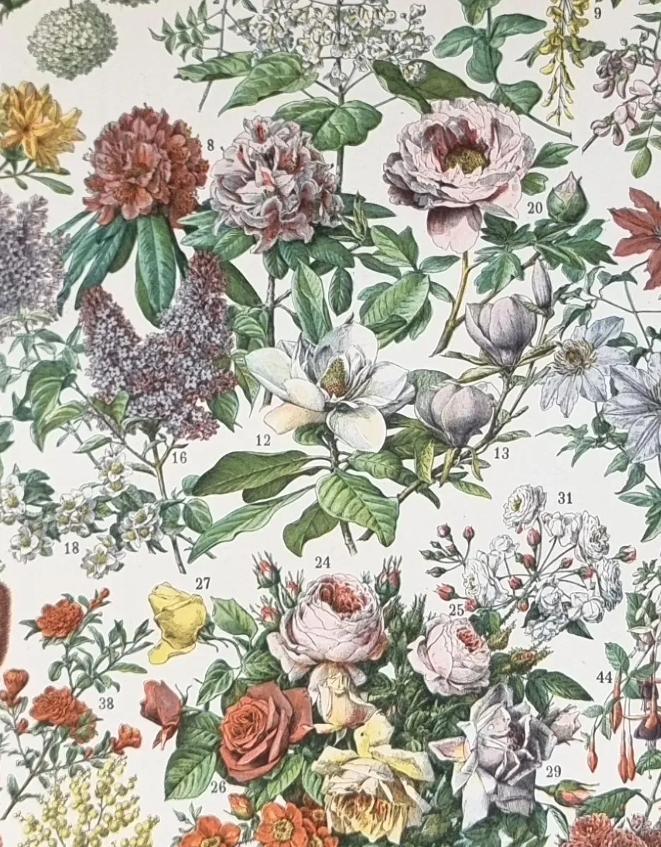 Grafika botaniczna kwiaty vintage to wyjątkowa ilustracja roślinna z końca XIX wieku, która łączy naukową precyzję z wyraźnie dekoracyjnym charakterem. Plansza przedstawia bogaty zestaw kwiatów ozdobnych – od pełnych, romantycznych róż i piwonii, przez delikatne magnolie i hortensje, aż po drobniejsze, subtelne formy roślinne. Kompozycja została ułożona w sposób harmonijny i czytelny, dzięki czemu całość przyciąga wzrok, ale nie dominuje przestrzeni.
