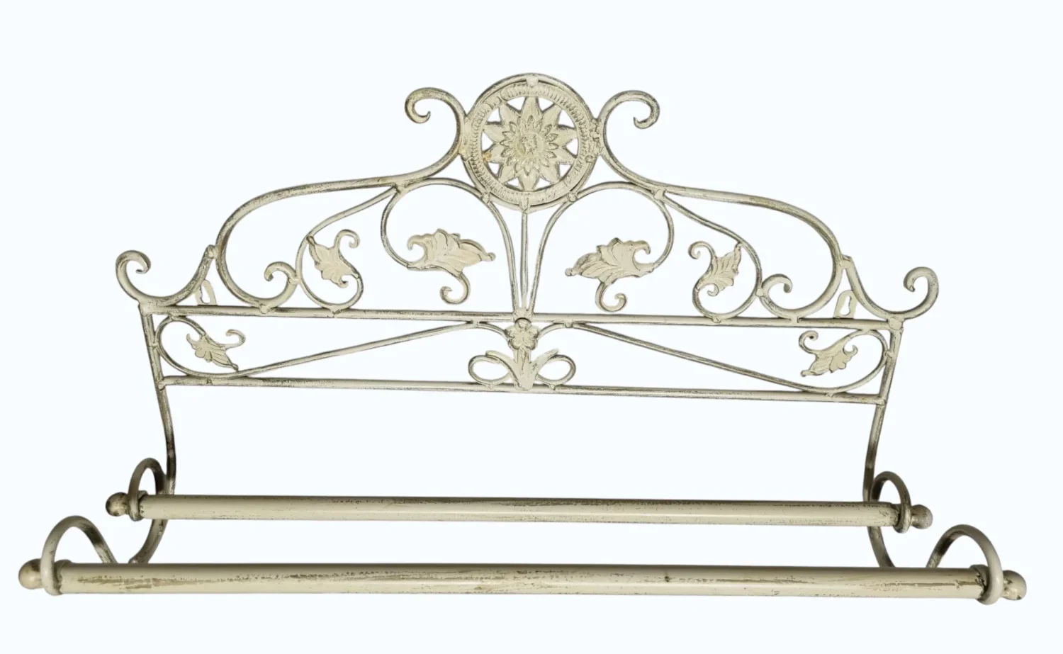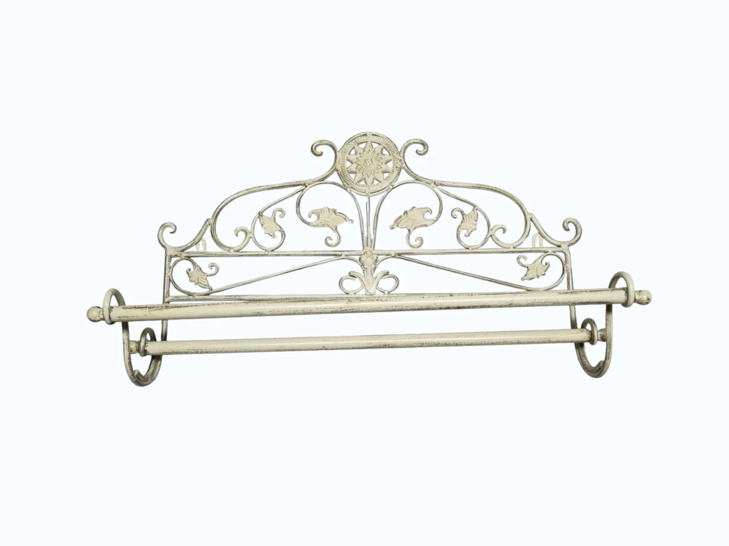 Metalowy wieszak shabby chic to dekoracyjny element wyposażenia wnętrz, który łączy funkcjonalność z wyraźnym, romantycznym charakterem. Zaprojektowany z myślą o estetyce prowansalskiej i shabby chic, doskonale wpisuje się w jasne, stylowe aranżacje łazienek, kuchni oraz wnętrz inspirowanych klimatem francuskiej prowincji. Jego forma przyciąga uwagę subtelnymi ornamentami roślinnymi oraz centralnym medalionem, który nadaje całości elegancji i lekko historyzującego wyrazu.