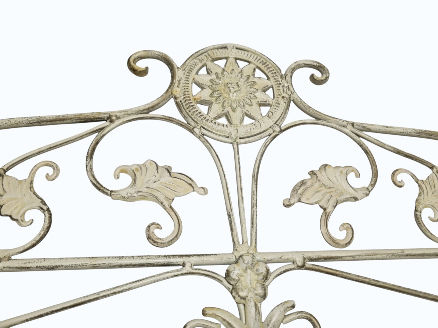 Metalowa konstrukcja wieszaka została wykończona w odcieniu kremowej bieli, przełamanej delikatną patyną i przetarciami. Taki sposób wykończenia nie jest wadą, lecz świadomym zabiegiem stylistycznym – to właśnie nieregularność koloru i delikatne ślady „zużycia” budują charakter shabby chic. Wieszak nie wygląda jak nowy, fabryczny przedmiot, lecz jak element z duszą, który idealnie komponuje się z bielonym drewnem, jasną ceramiką, naturalnymi tkaninami i pastelowymi dodatkami.