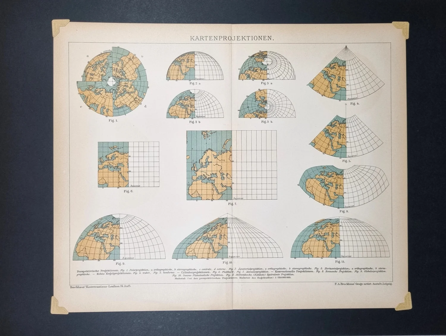Stara mapa świata 1898 to oryginalna plansza encyklopedyczna z niemieckiego wydania Brockhaus’ Konversations-Lexikon, z końca XIX wieku, przedstawiająca różne sposoby ukazywania globu na płaszczyźnie. To nie jest klasyczna mapa z granicami państw – to wizualne studium świata, pokazujące jak w epoce Belle Époque porządkowano wiedzę o Ziemi.