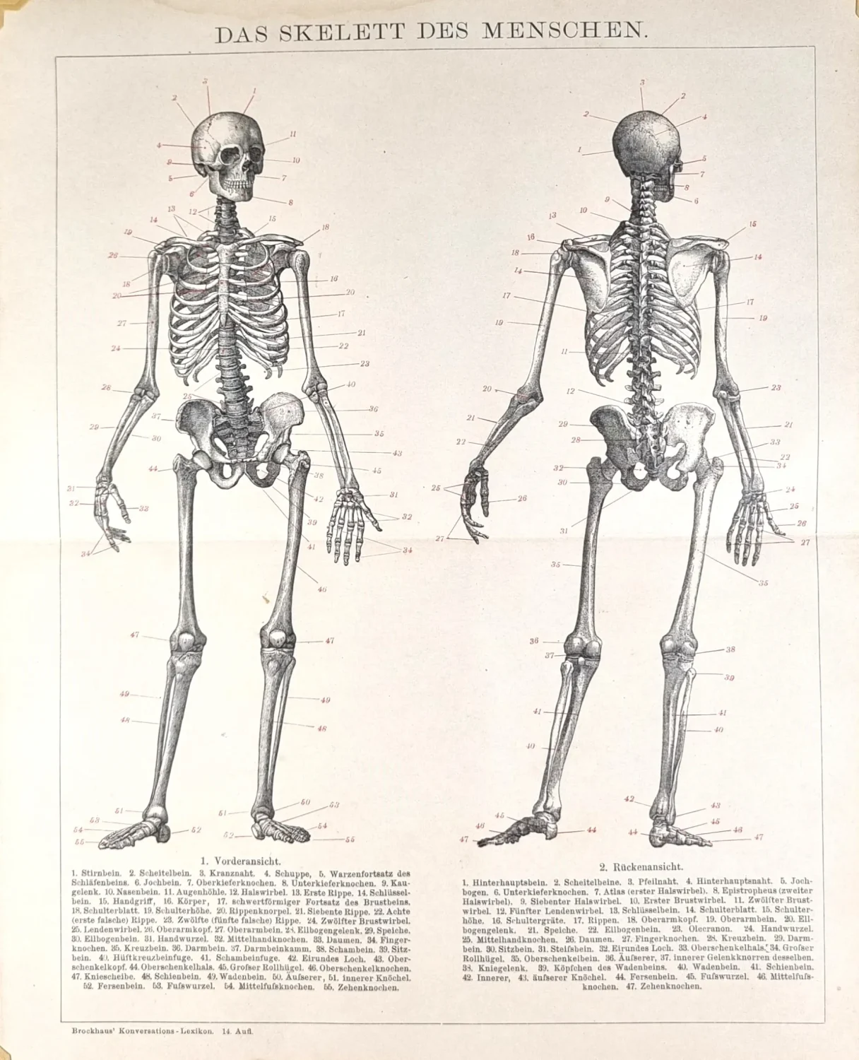 Szkielet człowieka grafika vintage to wyjątkowa ilustracja anatomiczna pochodząca z renomowanego wydawnictwa Brockhaus Konversations-Lexikon z 1898 roku. Przedstawia szczegółową budowę ludzkiego szkieletu w dwóch ujęciach – od przodu oraz od tyłu – zachowując charakterystyczną dla XIX wieku precyzję oraz estetykę naukowej ilustracji.